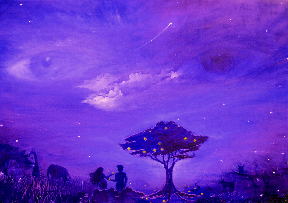 Tad cuse glas Gospoda, Boga, koji pred vece idjase po vrtu, i covek i zena njegova sakrise se od lica Gospoda, Boga, u drvece u vrtu. Ali Gospod, Bog, zazva coveka i rece mu: ''Gde si ti?'' Covek odgovori:''Cuo sam glas tvoj u vrtu, i uplasih se, jer sam go, pa se sakrih.'' A Gospod, Bog rece:''Ko ti kaza da si go? Da nisi jeo s onog drveta, s kog sam ti zabranio da jedes?''